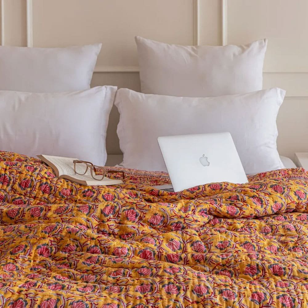 Experience the perfect blend of comfort and style with our Amber Yellow Printed Floral Boho Cotton Quilt. Handcrafted from 100% premium cotton, this reversible quilt features intricate block prints that add a touch of bohemian elegance to your space. Ideal for cozy nights or brightening up your decor, it’s a must-have for any home.