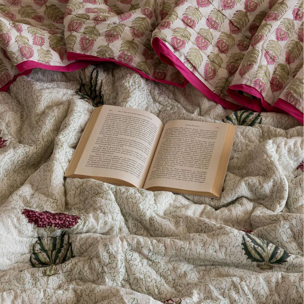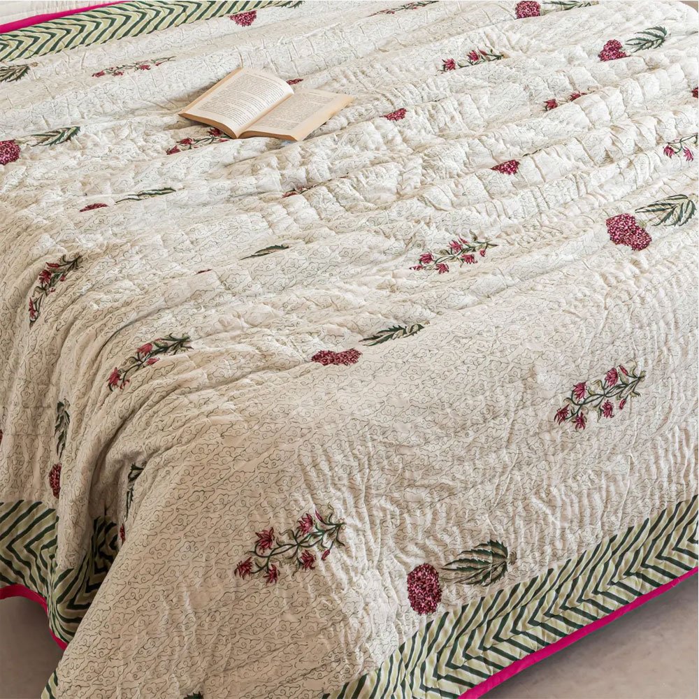 Experience the perfect blend of comfort and style with our Beige Printed Floral Boho Cotton Quilt. Handcrafted from 100% premium cotton, this reversible quilt features intricate block prints that add a touch of elegance to your space. Ideal for cozy nights or as a decorative layer, it invites warmth and tranquility into your home.