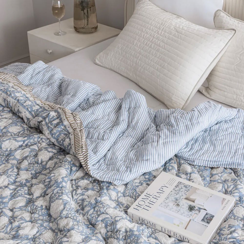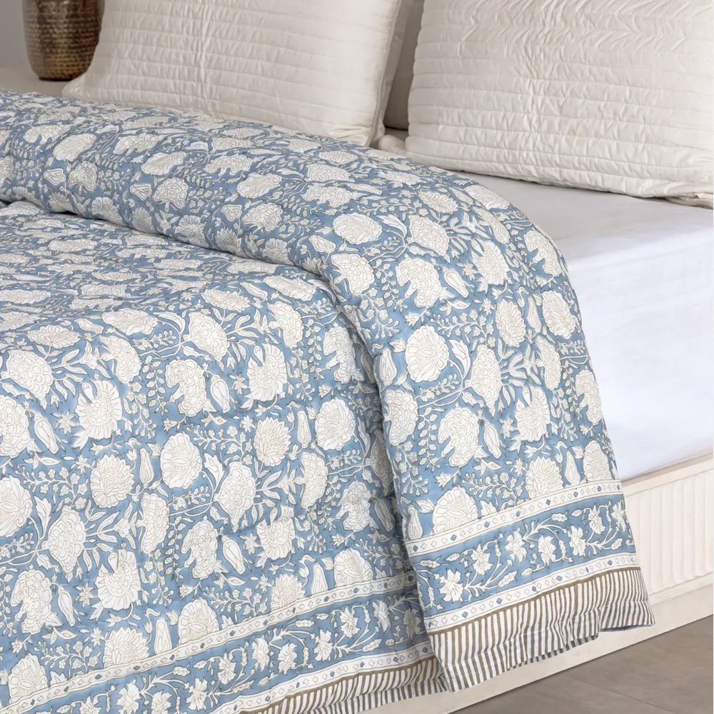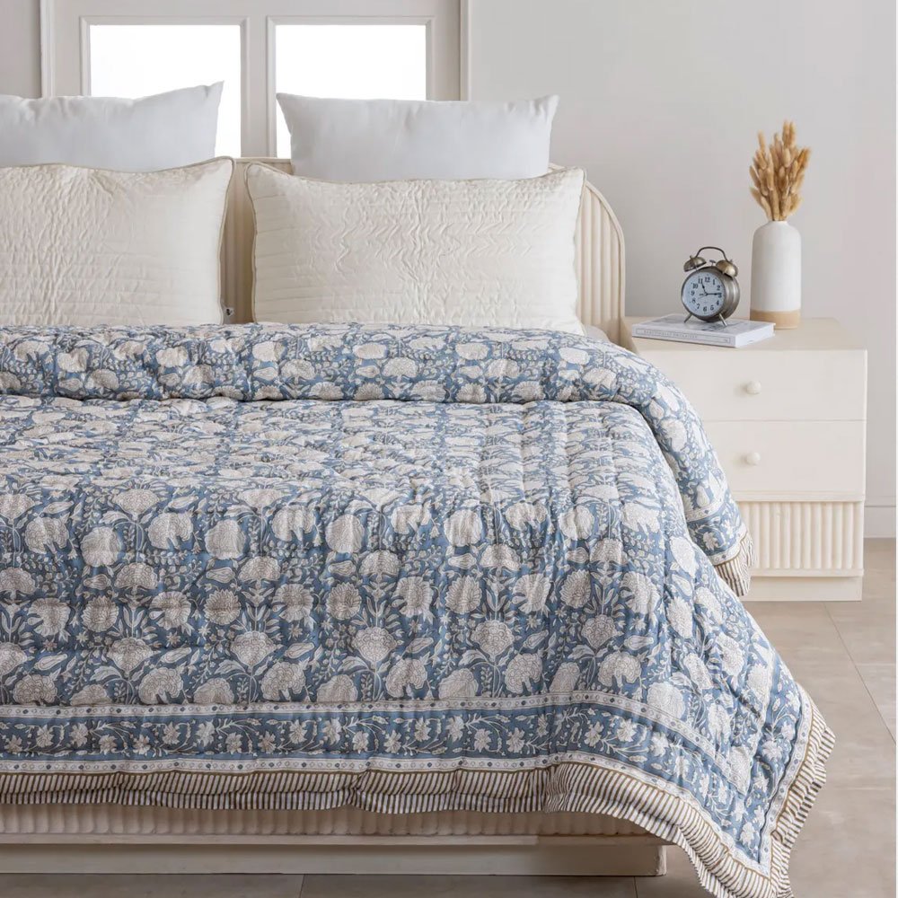 Experience the perfect blend of comfort and style with our Dusty Blue Printed Floral Boho Cotton Quilt. Handcrafted from 100% premium cotton, this reversible quilt features intricate block prints that add a touch of elegance to your space. Ideal for cozy nights or as a stunning decorative piece, it invites warmth and tranquility into your home.