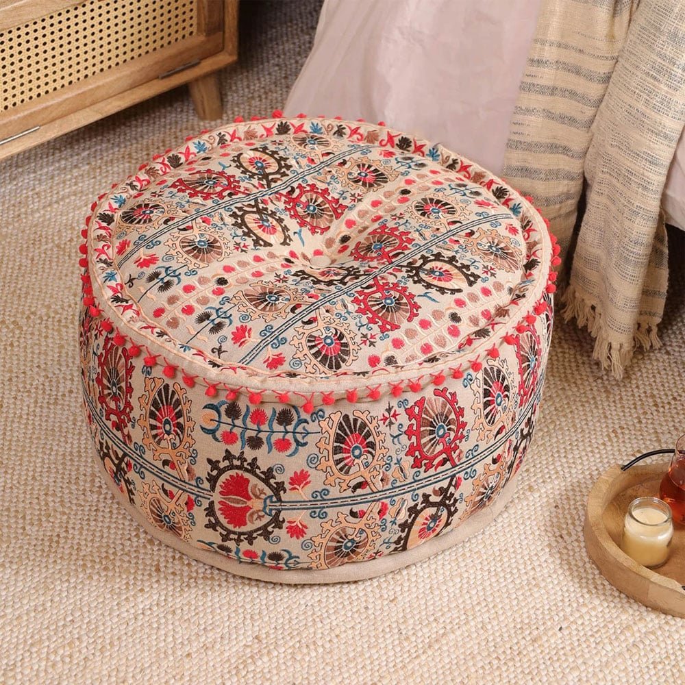 Transform your living area with this beautifully embroidered boho ottoman pouf. Handcrafted from durable chambray cotton, it serves as both a stylish accent and a functional seating option. Fill it with your old cushions or eco-friendly materials for a personalized touch that enhances your home’s warmth and charm.