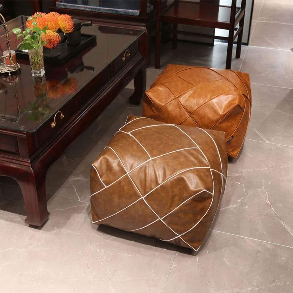 Elevate your home decor with this exquisite hand-stitched leather ottoman, perfect for adding a touch of bohemian elegance. Ideal for casual seating or as a stylish footstool, its minimalist design complements any room while inviting comfort and warmth. Fill it with your choice of materials for a personalized touch.