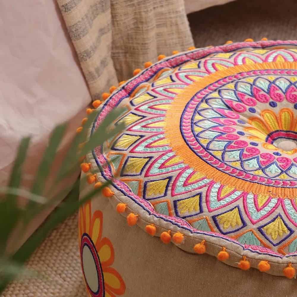 Transform your living area with this stunning orange and beige boho ottoman pouf. Handcrafted from soft cotton, it serves as both a stylish accent and a functional seating option. Perfect for cozy gatherings or as a decorative piece, this pouf invites warmth and creativity into your home. Fill it with your own materials for an eco-friendly touch!