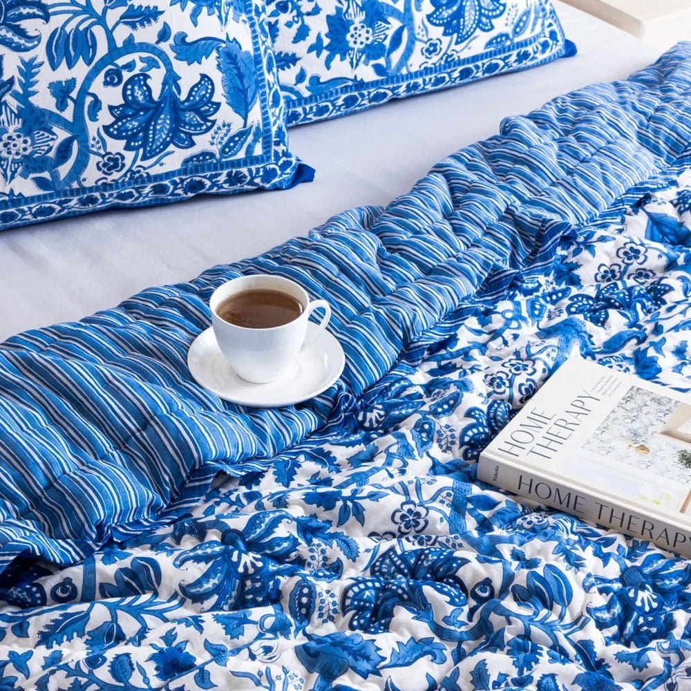 Experience the perfect blend of comfort and style with our Pottery blue printed floral boho cotton quilt. Handcrafted from 100% premium cotton, this reversible quilt features intricate block prints that add a touch of artistry to your space. Ideal for cozy nights, it invites warmth and tranquility into your home.