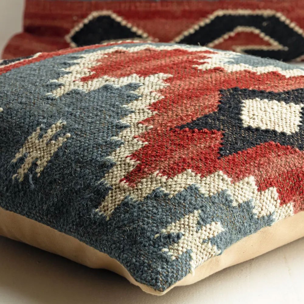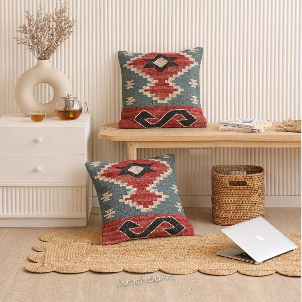 Add a touch of earthy elegance to your space with our Slate Blue and Rust Kilim Boho Pillows